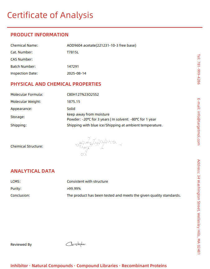 AOD9604;polypeptideAOD9604;peptidesAOD9604;L-Phenylalanine,L-tyrosyl-L-leucyl-L-arginyl-L-isoleucyl-L-valyl-L-glutaminyl-L-cysteinyl-L-arginyl-L-seryl-L-valyl-L-α-glutamylglycylChemicalbook-L-seryl-L-cysteinylglycyl-,cyclic(7→14)-disulfide;InjectableLyophillzedPowderPeptidesPeptideAod-9604Aod9604Aod96042mg/Vial;HGHfrag176-191Oxidized;AOD9604acetate;Fragment177-191